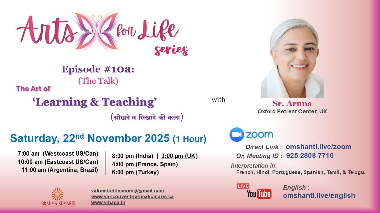 Please join us online on November 22nd, 7 AM PST for a talk on 'The Art of Learning & Teaching': gain familiarity and insights into the celestial art with Sr Aruna from the BK Oxford Retreat Center, UK.