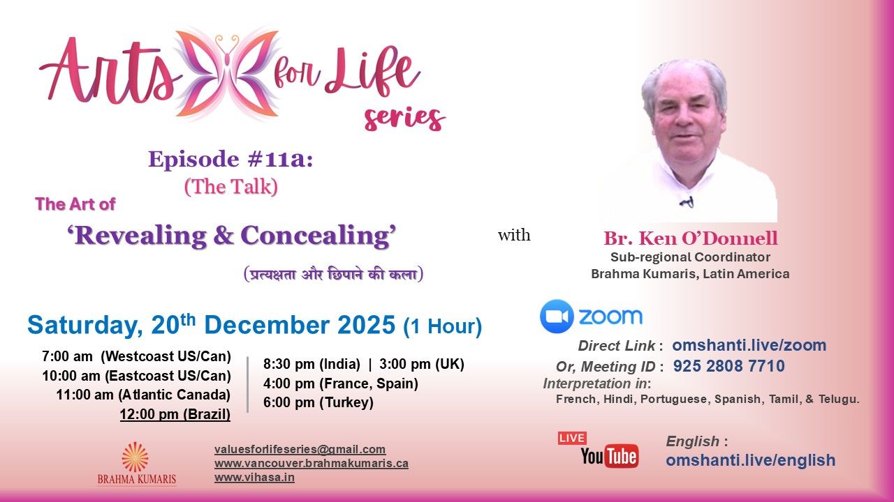 Please join us online on December 20th, at 7 AM PST for a talk on 'The Art of Revealing and Concealing'. Gain familiarity and insights into the celestial art with Br Ken O'Donnell, Sub-Regional Coordinator, Brahma Kumaris, Latin America.