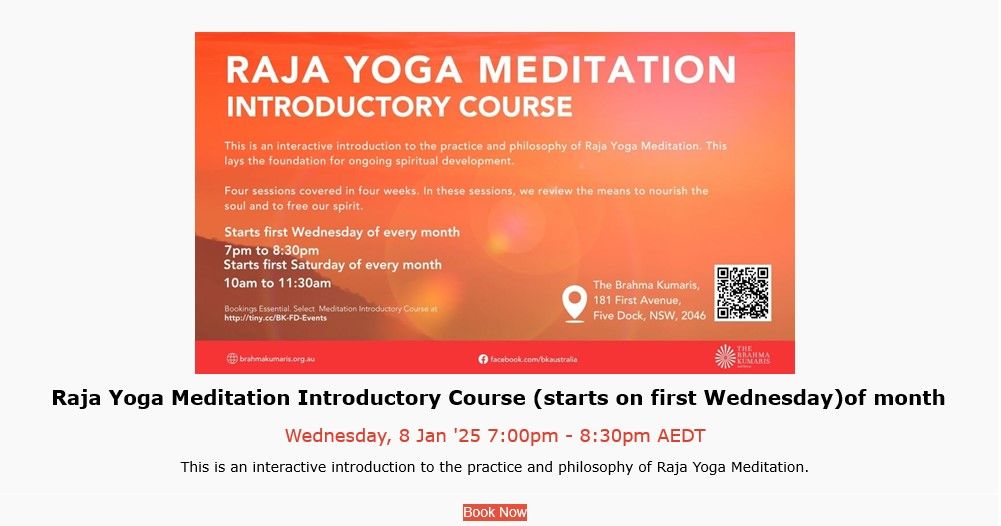 Raja Yoga Meditation Introductory Course First Wednesdays and First Saturdays 2026
