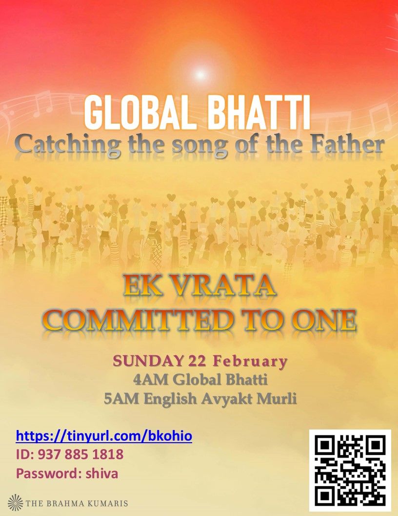 You're invited to join us for Global Bhatti, catching the song of the Father 'Subtlety Of Purity', followed by an English Avyakt Murli.