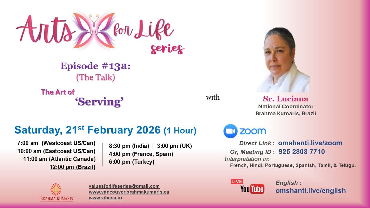 Please join us online on February 21st, at 7 AM PST for a talk on 'The Art of Serving'. Gain familiarity and insights into the celestial art with Sister Luciana, National Coordinator, Brahma Kumaris, Brazil.